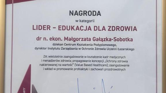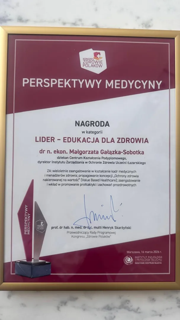 Wyróżnienie dla dr Małgorzaty Gałązki-Sobotki jest jednocześnie potwierdzeniem jakości i znaczenia działań edukacyjnych realizowanych w ramach Łazarski Executive Education oraz programu MBA w ochronie zdrowia.